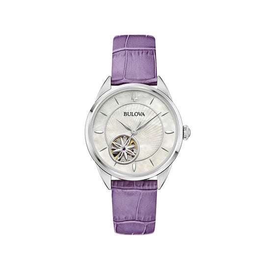 CLASSIC: This watch features a mother of pearl dial with silver toned hands and features as well as an open-heart window to view the inner workings of the watch, all protected by sapphire crystal glass. The case of the watch measures 36mm and is made from stainless-steel. The look of the watch is finished off with a purple leather band.