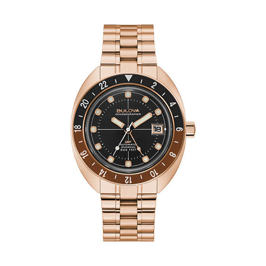 OCEANOGRAPHER DEVIL DIVER: This watch features a black dial with rose gold toned, luminescent hands and features as well as a GMT hand and a date window, all protected by box shaped sapphire crystal glass. The case of the watch features a one way, black and brown rotating bezel, it measures 41mm and is made from rose gold plated, stainless-steel, as is the matching band.