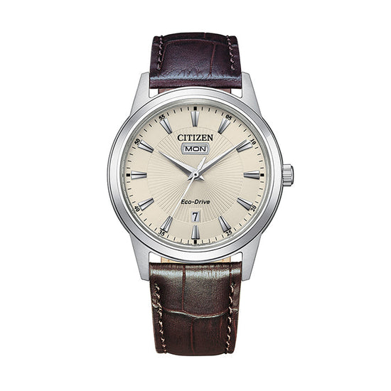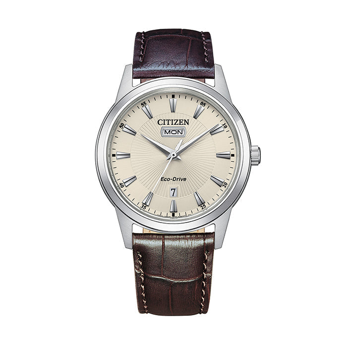This watch features a textured ivory dial with silver toned features including day and date windows. The case of the watch measures 40mm and is made from stainless-steel. The look of the watch is finished off with a brown leather band.