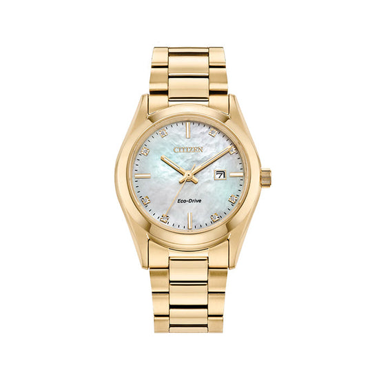 This watch features a mother of pearl dial with gold toned features including crystal hour markers as well as a date window, all protected by sapphire crystal glass. The case of the watch measures 33mm and is yellow gold plated as is the matching band.