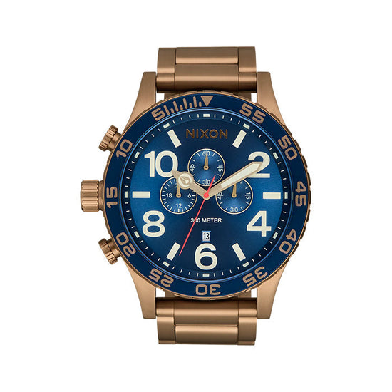 DESERT ARIES: The dial of this watch is a rich, metallic blue with white, bronze and orange toned highlights. The dial also features chronograph sub-dials as well as a date window. The case of the watch measures 51mm and is made from bronze toned stainless-steel with a matching band.